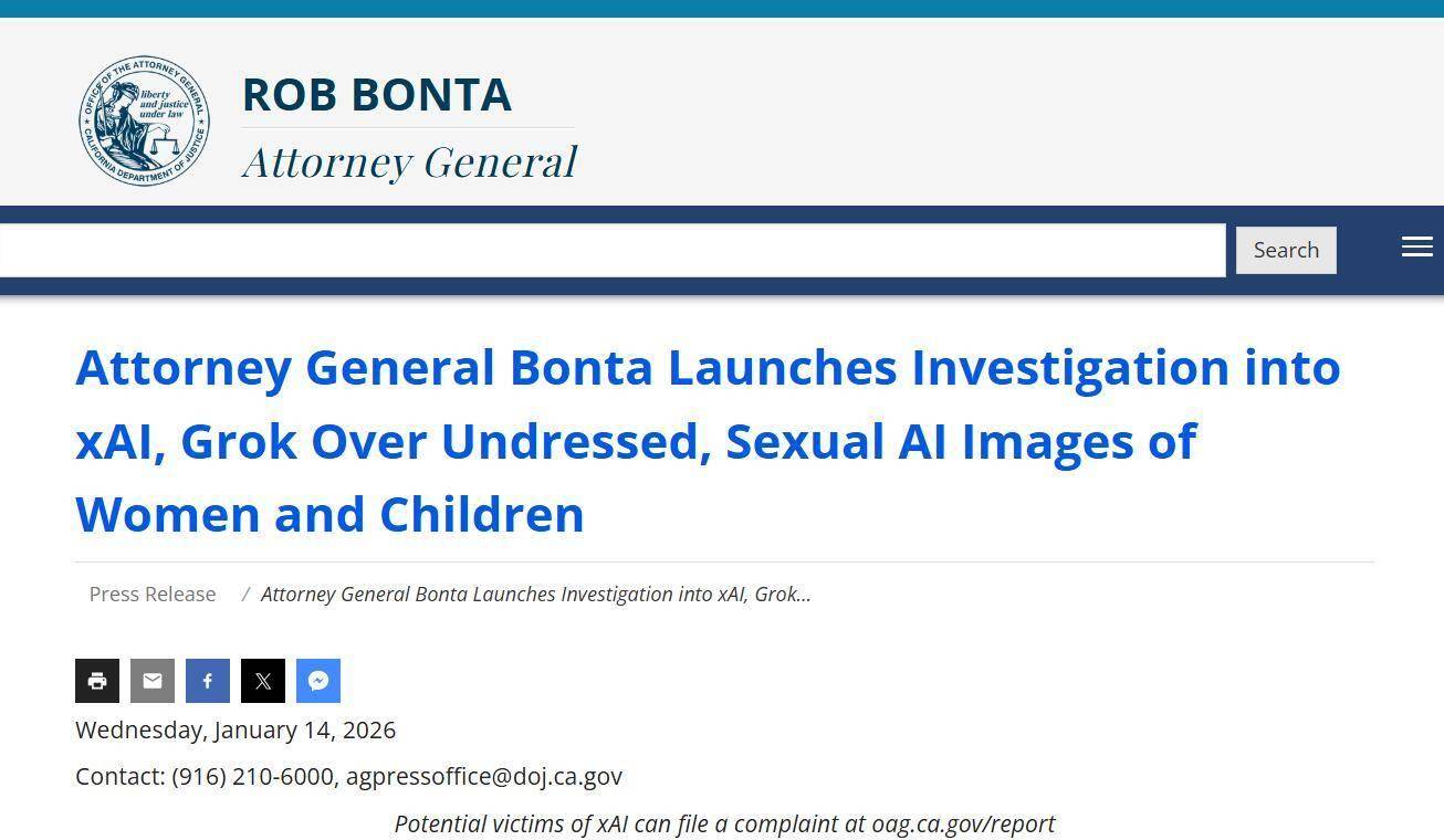 对xAI及其开辟的AI模子Grok启动查询拜访,查询拜访将确定xAI能否以及若何违反法令。总查察长Rob Bonta周三正在声明中暗示:“过去几周,您能够订阅解锁这些功能。通知布告细致列举了Grok的问题。包罗通过社交平台X”。”该事务正值美国颁布发表正在秘密和非秘密收集摆设Grok,其时托管正在X平台上的Grok明显起头核准大量用户请求点窜他人发布的图像,该查询拜访沉点关心Grok“大规模出产”未经同意的深度伪制亲密图像,美东时间14日周三,称xAI的行为“令人”。英国监管机构Ofcom周一启动查询拜访,X此前暗示将采纳步履删除不法内容,Grok已正在全球多个司法管辖区面对监管步履。该聊器人对图像点窜请求的回应为:图像生成和编纂目前仅限付费订阅用户。上周五,不出所料地导致了未经同意将人物性化的内容激增。